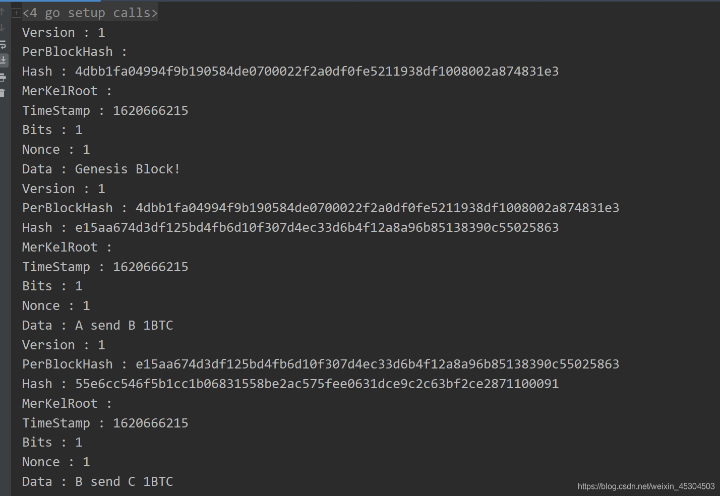 func getinfo(n int) { /* runtime.Caller()返回四个参数: pc: 记录了调用的函数消息,如函数名等 file: 调用的文件名 line: 行数 OK: 返回的bool值 */ pc, file, line, ok := runtime.Caller(n) if !ok { fmt.Printf("runtime.Caller() failed\n") return } fmt.Println(pc) // 用于调用函数消息 funcName := runtime.FuncForPC(pc).Name() // 利用 runtime.FuncForPC()方法,参数pc序号,可以调出函数名 fmt.Println(funcName) fmt.Println(file) // 打印出执行的文件的绝对路径 fmt.Println(path.Base(file)) // path.Base()方法可以获取传入的绝对路径的最后一个文件名称 fmt.Println(line) // 打印出执行的行号